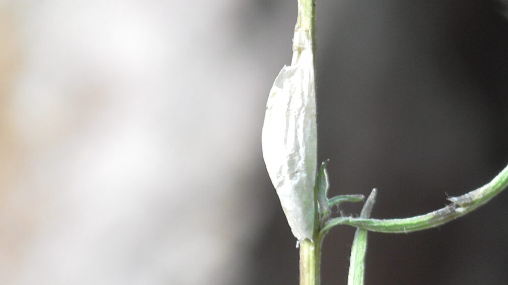 Was wie ein unscheinbares abgestorbenes Pflanzenteil an der Flockenblume aussieht (Foto 2), ist das Kokon eines Hornklee- Widderchens.